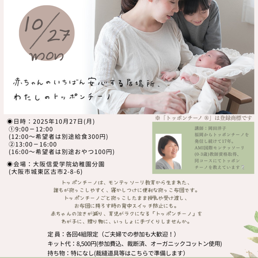 福岡市在住。インドネシア人の夫と3人の子どもがいます。長男の妊娠中、モンテッソーリ教育を行うエミール保育園(福岡市早良区)でトッポンチーノと出会いました。生まれたばかりの息子をトッポンチーノで抱っこした瞬間、泣き止んで穏やかになった姿に感動したのです。